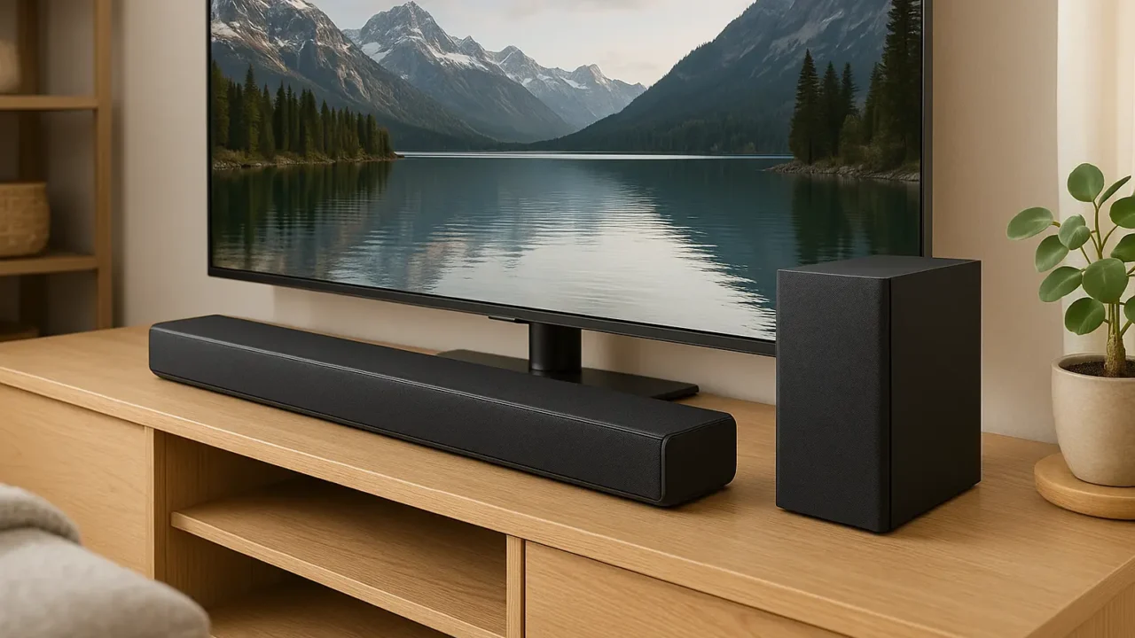 A soundbar Samsung HW-B555 tem 320W de potência, suporte a Dolby Audio, Bluetooth e um design elegante que combina com qualquer TV.