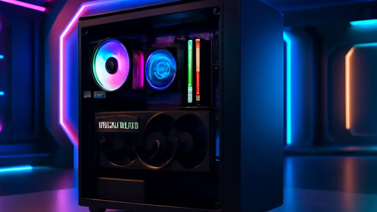 O gabinete com design agressivo e excelente fluxo de ar é outro componente essencial para o desempenho deste PC. A ventilação é crucial, especialmente considerando o alto desempenho de seus componentes. Além disso, o design externo é ajustado para quem busca um visual gamer, com painéis laterais em vidro temperado e iluminação RGB para complementar o setup. Um bom sistema de fluxo de ar garante que sua máquina funcione sem problemas durante sessões de uso prolongado.