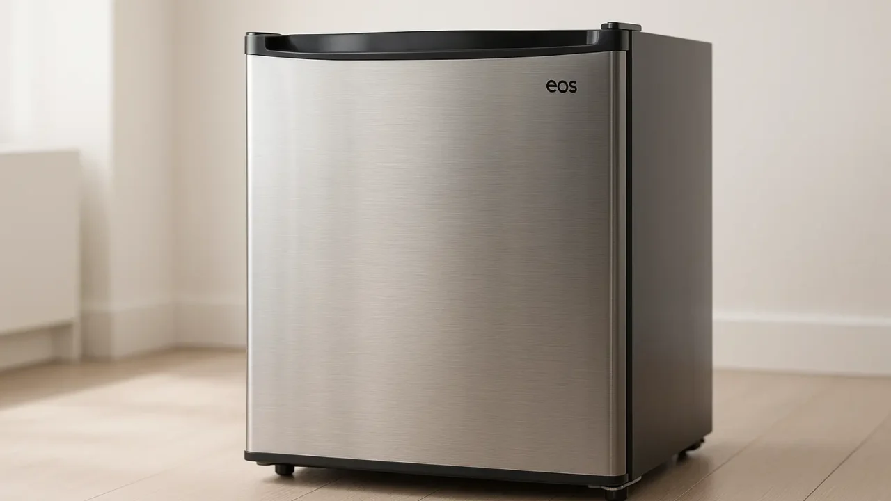 O frigobar Eos tem uma capacidade de 93 litros, ideal para armazenar bebidas e alimentos de forma prática.